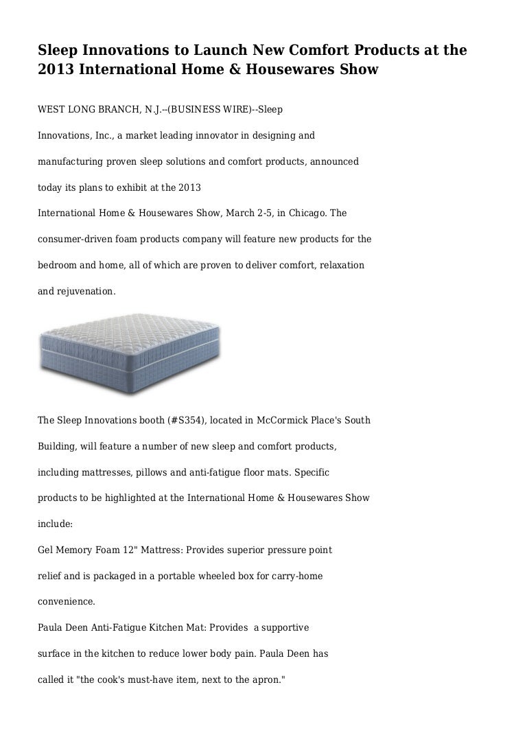 Sleep Innovations To Launch New Comfort Products At The 2013 Internat