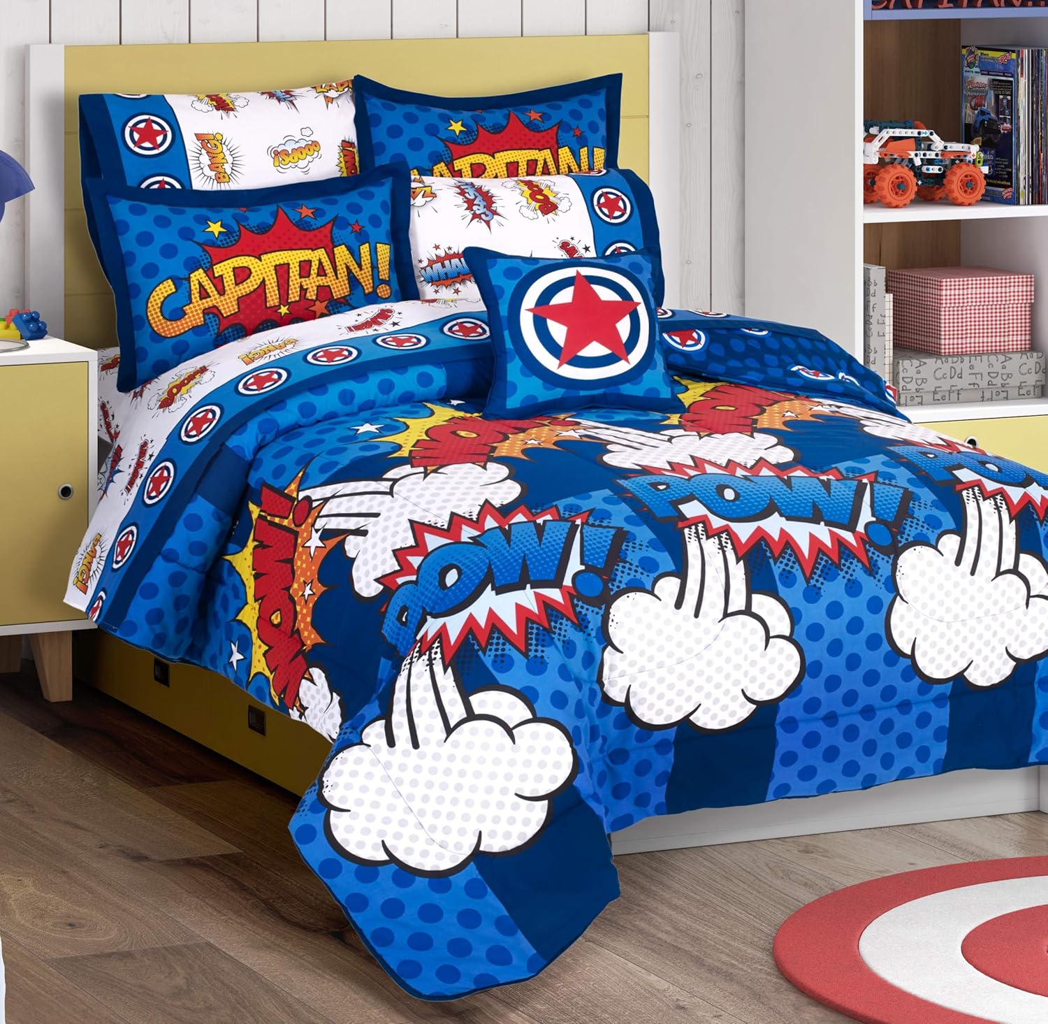 Amazon Com Primor Casa Capitan Comic Book Super Heroes 4 Pieces Reversible Comforter Set For Boys Kids Teens Blue Cotton Rich Bedding Set Full Size Home Kitchen