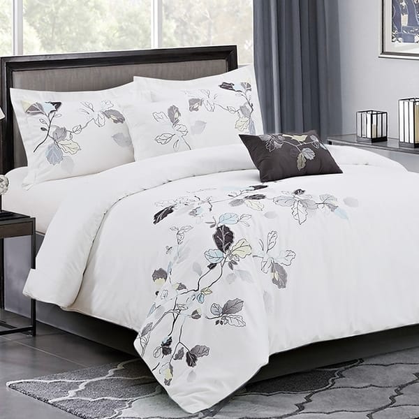 Full Queen 100 Percent Cotton Comforter Set With Grey White Floral Branch Pattern Fastfurnishings Com