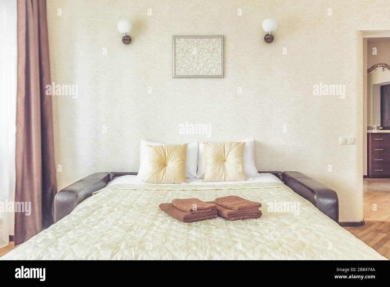 Pillow On Bed And Nightstand In Cozy Comfortable Bedroom In Beige Color Stock Photo Alamy