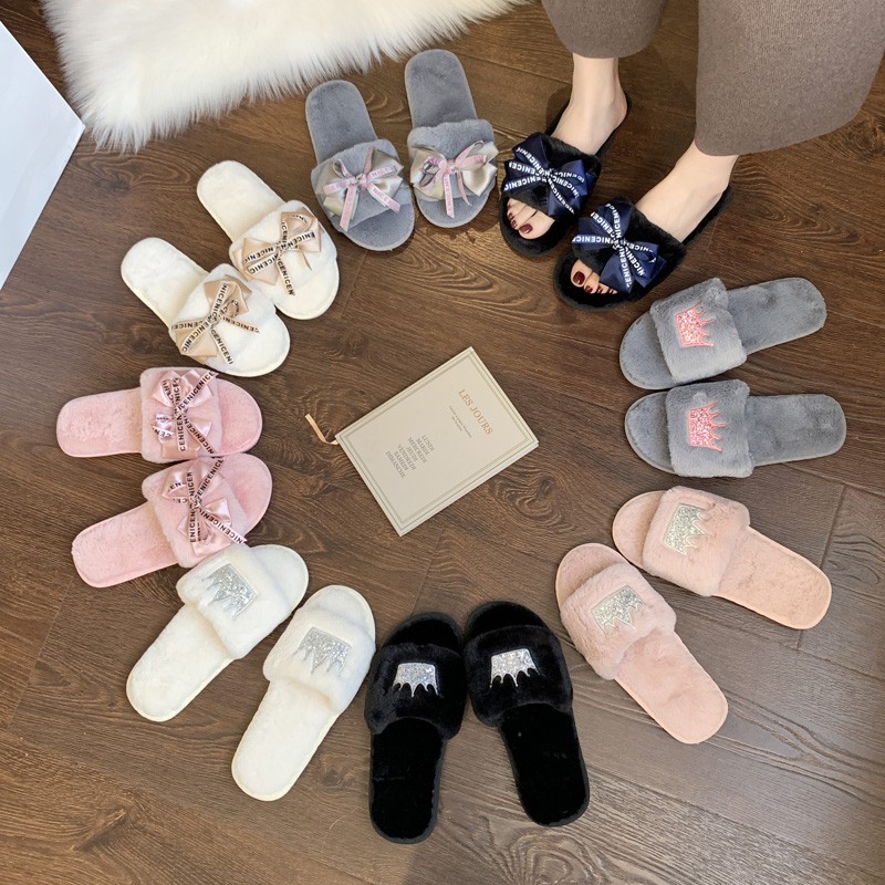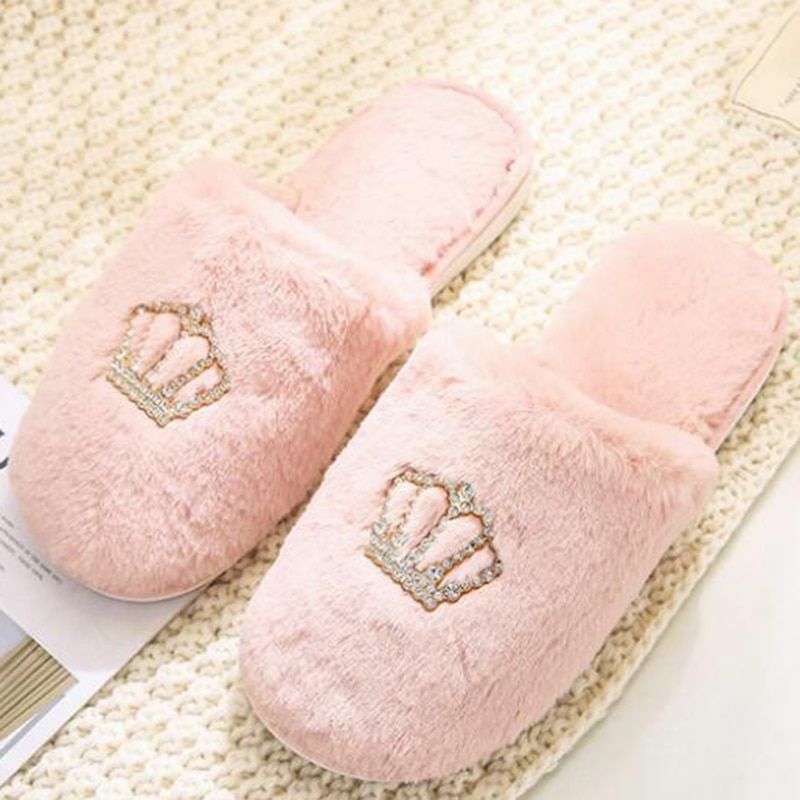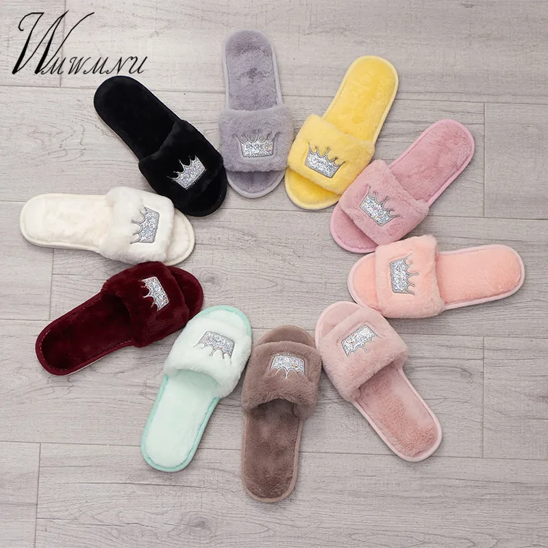 Women Luxury Slippers Sequined Glitter Crown Winter Indoor Flip Flop Casual Warm Fake Fur Solid Color Fashion Home Shoes Autumn Slippers Aliexpress