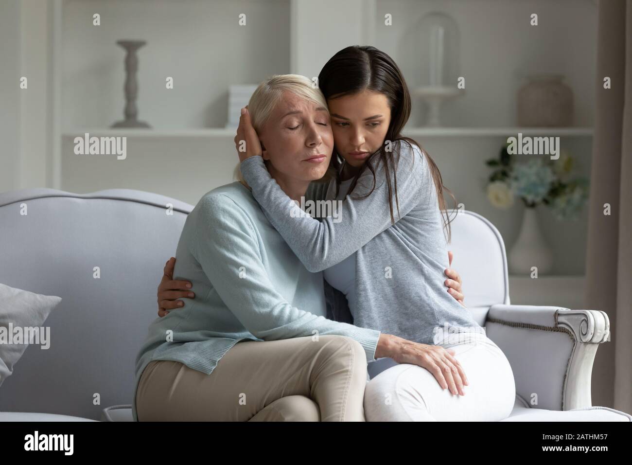 Loving Adult Daughter Cuddle Comfort Upset Mature Mom Stock Photo Alamy