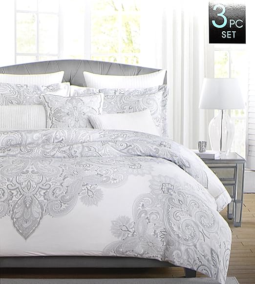 Cynthia Rowley Bedding 3 Piece Full Queen Zoraya Metalic Duvet Cover Set 100 Cotton Sateen Classical Ornate Print Floral Medallions In Pastel Shades Of Light Gray Platinum And Light Blue On White Amazon Ca