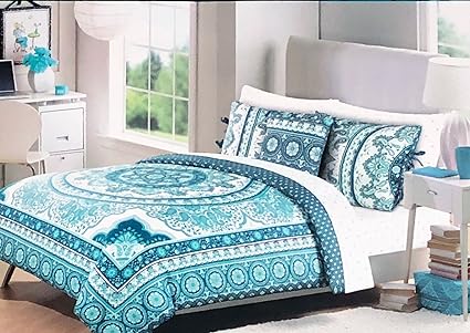 Cynthia Rowley Bedding 3 Piece Full Queen Size Duvet Comforter Cover Set Round Vintage Boho Medallion Hippie Bohemian Tapestry Pattern In Shades Of Blue Aqua Green On White Quinn Medallion Amazon In Home