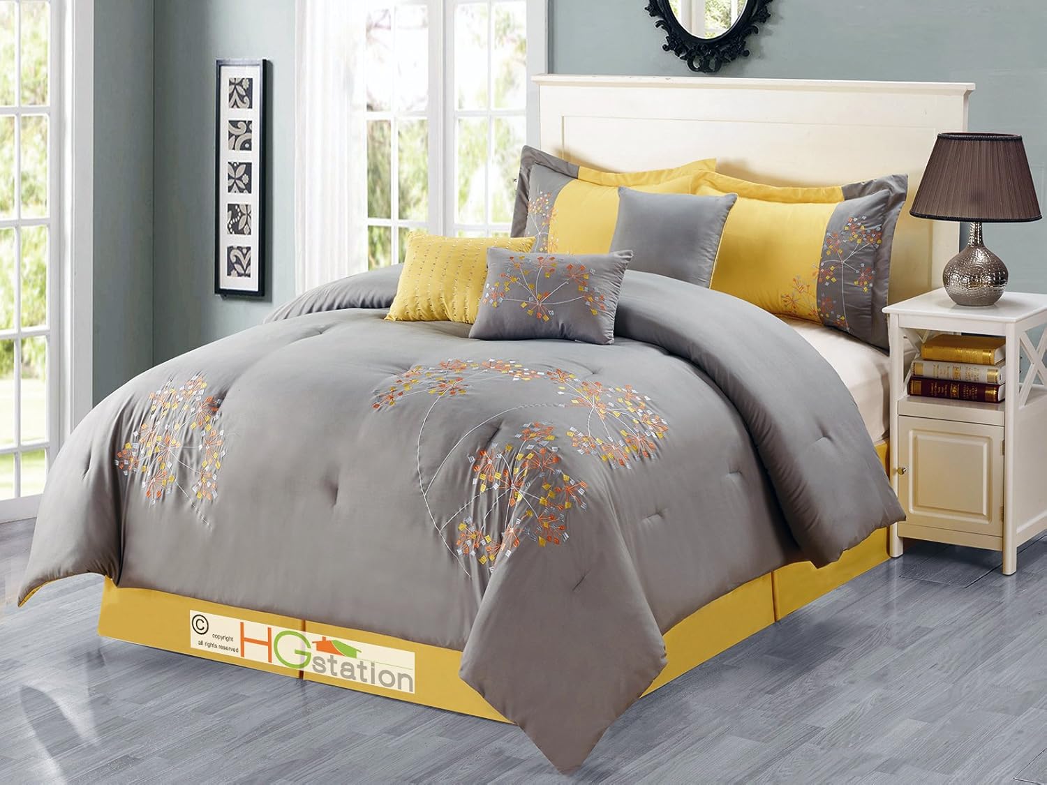 Amazon Com Hgs 7 Pc Bright Cheerful Dandelion Floral Meadow Embroidery Comforter Set Yellow Gray Silver Queen Home Kitchen