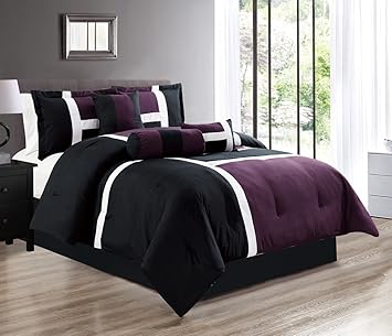7 Piece Oversize Dark Purple Black Color Block Emma Comforter Set 104 X 92 King Size Bedding Amazon In Home Kitchen