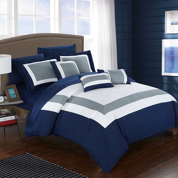 Amazon Com Chic Home Cs1459 10 Piece Duke Patchwork Color Block Complete King Bed In A Bag Comforter Set Navy Sheets Included Home Kitchen
