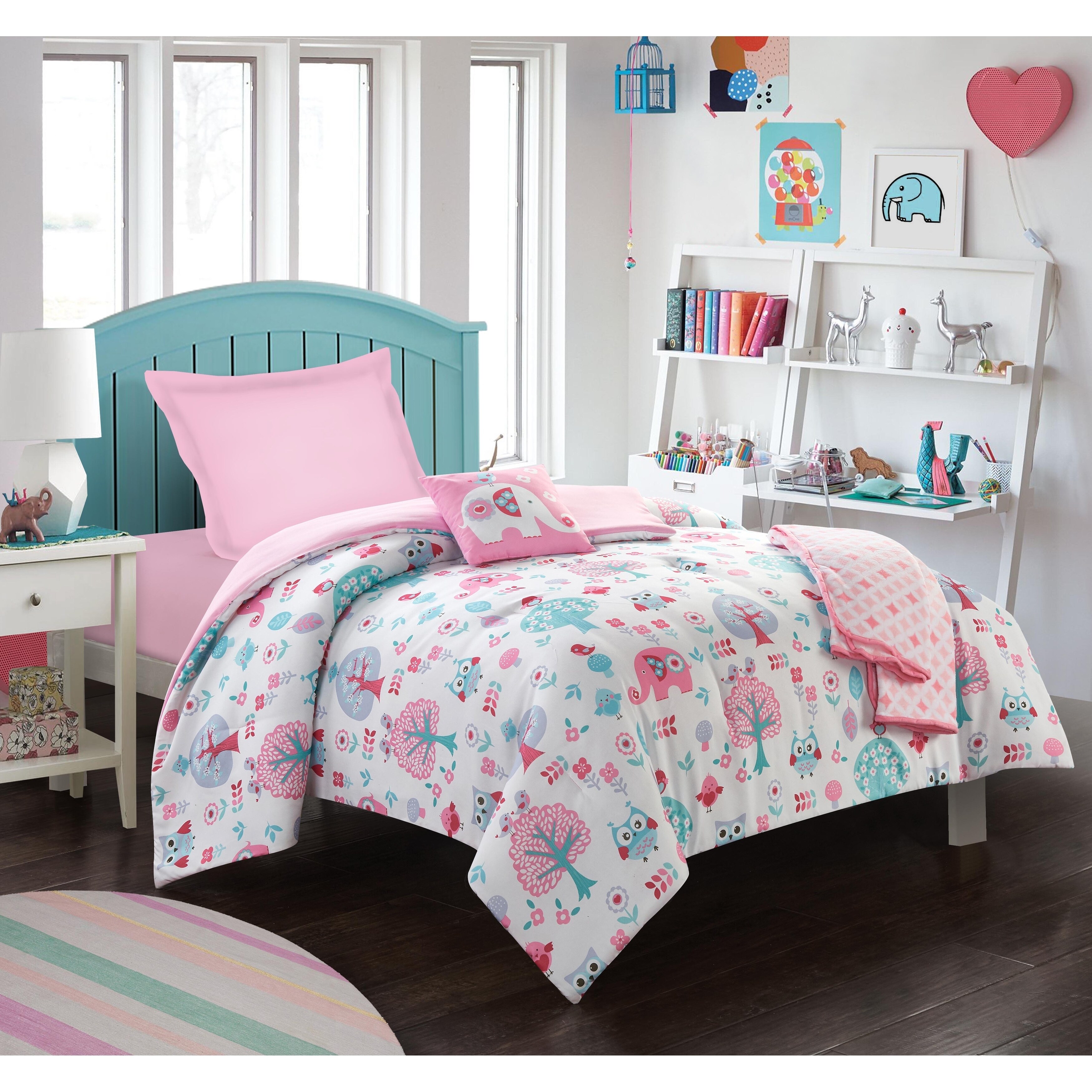 Amazon Com 4 Piece Elephant Comforter Twin Set Owl Bedding Kids Girls Forest Friends Outdoor Animal Floral Motif Themed Pattern Pink Teal Blue White Microfiber Home Kitchen