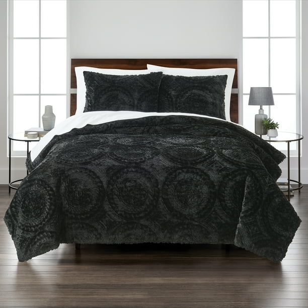 Better Homes Gardens Embroidered Faux Fur 3 Piece Comforter Set Full Queen Black Walmart Com Walmart Com