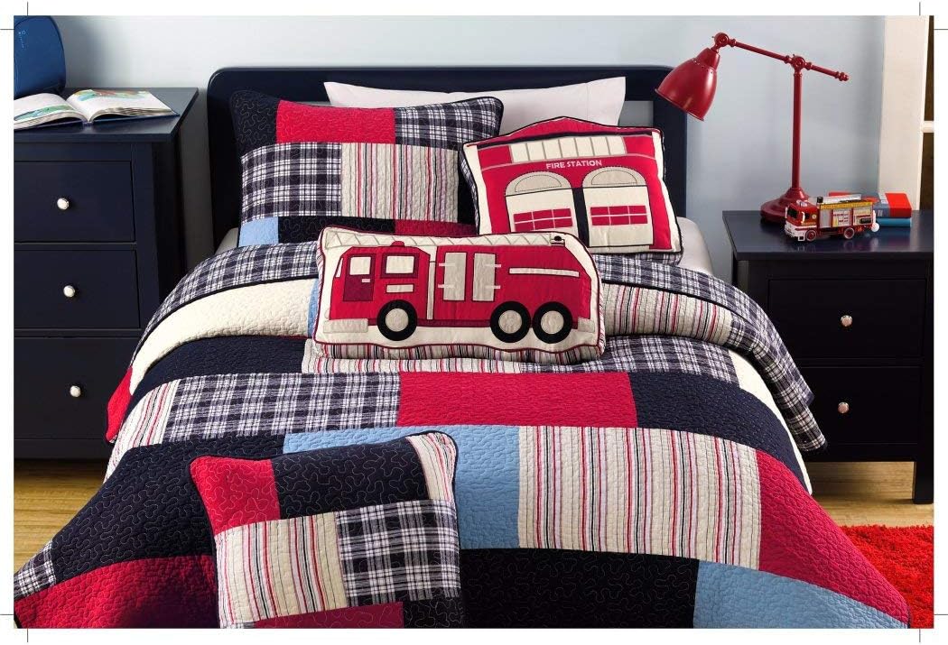 Amazon Com Os 2 Piece Fireman Quilt Set This Fireman Bedding Collection Features Plaid Accents Boys Blue Red Multi Color Rainbow Twin Size Firefighter Color Themed Bedding 100 Cotton Home Kitchen