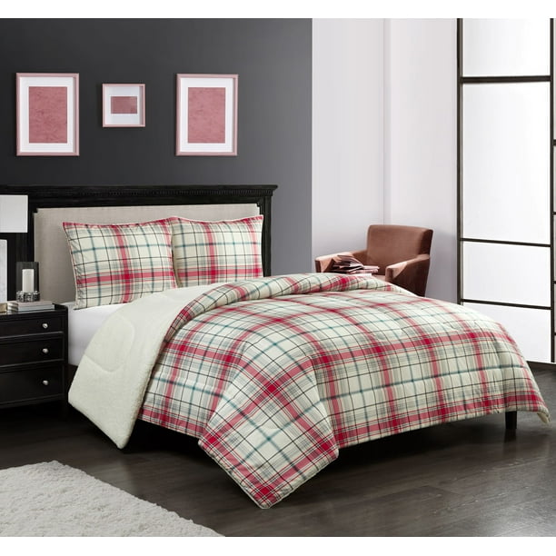 Mainstays Cozy Flannel Reverse To Super Soft Sherpa 3 Piece Comforter Set Full Queen Red And Green Plaid Walmart Com Walmart Com