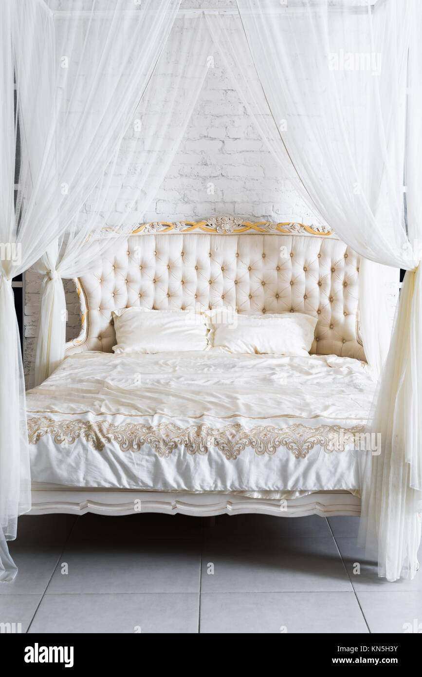 Bedroom In Soft Light Colors Big Comfortable Four Poster Double Bed Stock Photo Alamy