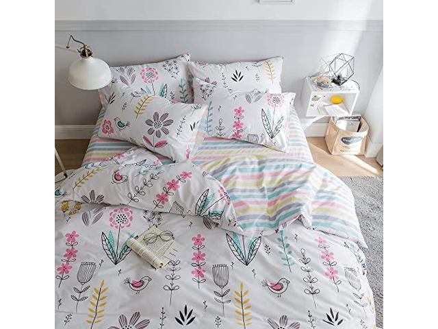 Floral Printed Bedding Sets Queen Duvet Cover Girls Cotton Comforter Cover Full Size Fresh Garden Design Reversible Striped Bedding Sets 3 Piece Full Bed Comforter Cover Duvet Cover Set Toy Storage