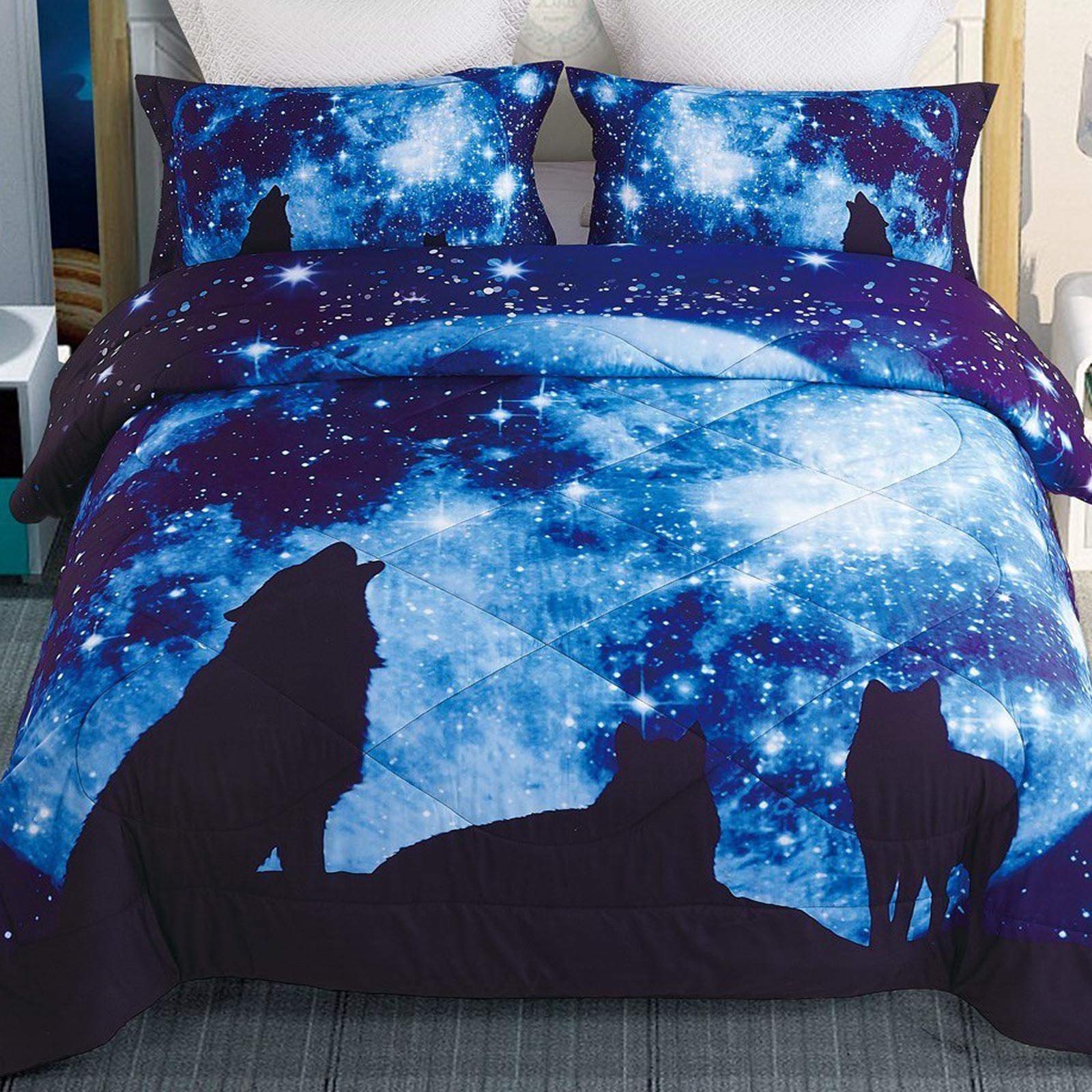 Amazon Com 3d Wolf Moon Galaxy Comforter Bedding Sets With Pillowcases Twin Full Queen Size 3 Pieces 1 Comforter 2 Pillowcases Super Soft Wolf Moon Galaxy Comforter Sets Full Kitchen Dining