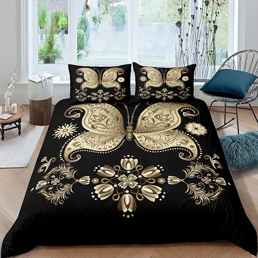 Amazon Com Golden Butterfly Comforter Cover Set Exotic Luxury Style Bedding Set With Zipper Ties Gold Botanical Floral Palm Leaves Pattern Decor Duvet Cover For Adult Women Girls Soft Microfiber Bedspread Queen Home