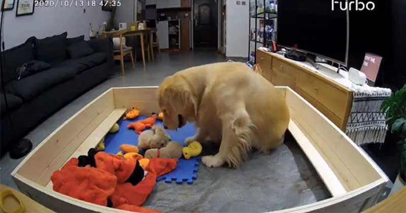 First Time Golden Retriever Mom Comforts Her Whining Pups With All Her Favorite Toys