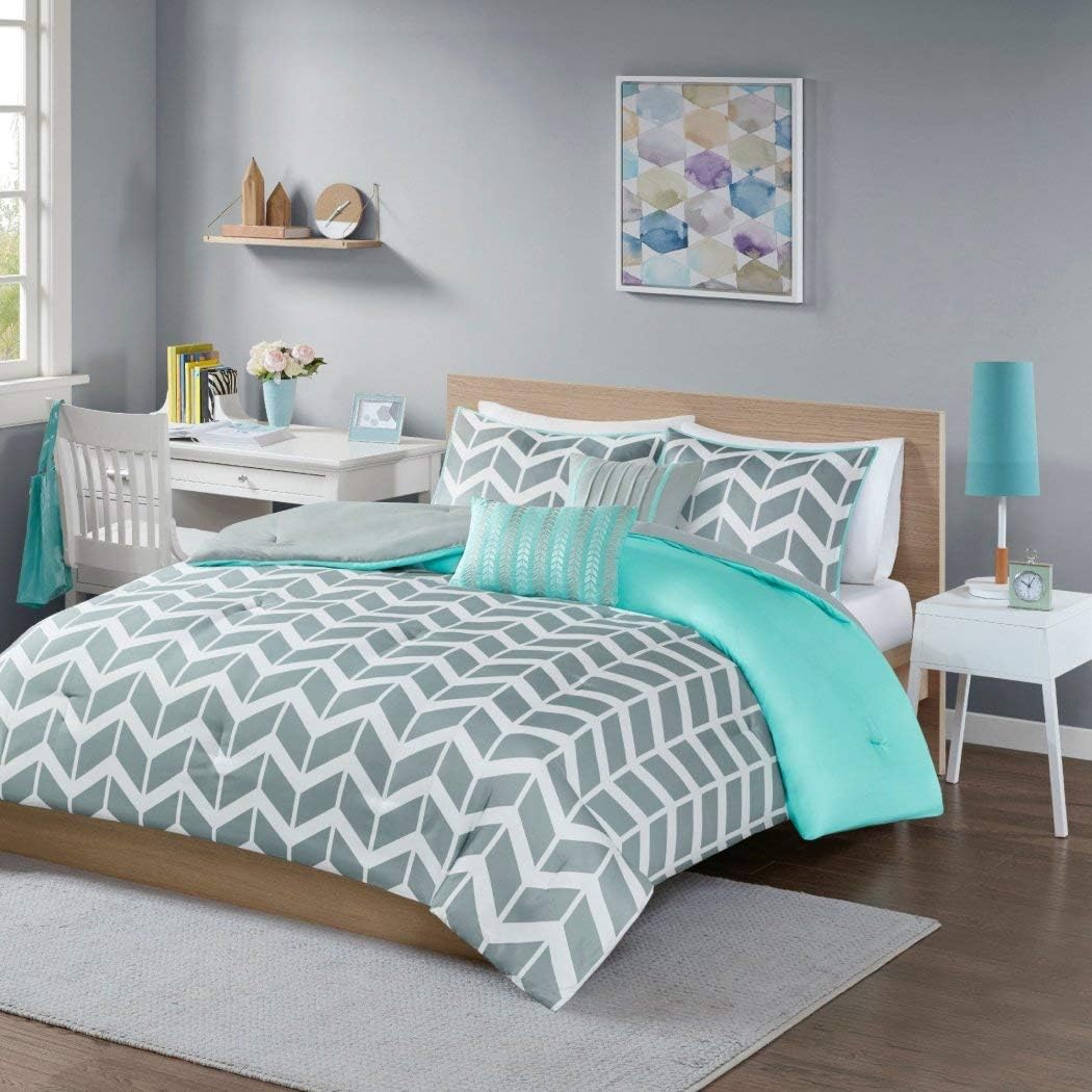 Amazon Com Modern Grey And White Chevron Stripes With Aqua Accents Comforter Bedding Set King Cal King Kitchen Dining