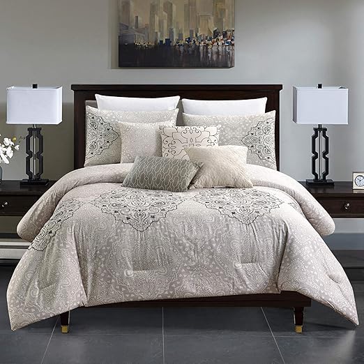 Amazon Com Sapphire Home Luxury 7 Piece Full Queen Comforter Set With Shams And Cushions Classy Embroidery Silver Light Gray Damask Pattern Bed Cover Bed In A Bag 21811 Queen Home Kitchen