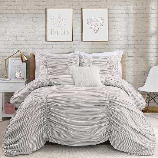 Amazon Com Lush Decor Gray Ruching Ticking Stripe 3 Piece Comforter Set Full Queen Home Kitchen