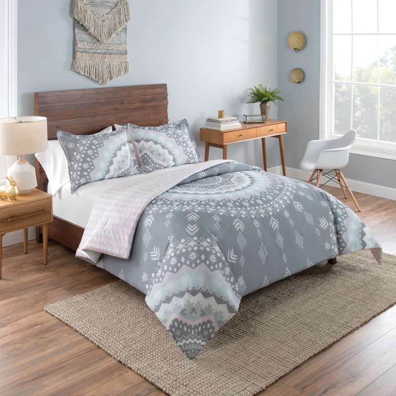 Amazon Com Fun And Bold Mainstays Gray And Teal Bed In A Bag Modern Comforter Set Geometric Triangle Print With Teal Blue Gray And Pink Coral Great For Dorms And Kid S Rooms Queen