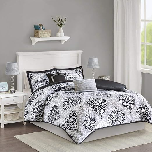 Amazon Com D H 5 Piece Black Grey Damask Floral Comforter Full Queen Set Black White Adult Bedding Master Bedroom Modern Stylish Medallion Pattern Quatrefoil Shape Elegant Themed Traditional Polyester Home Kitchen