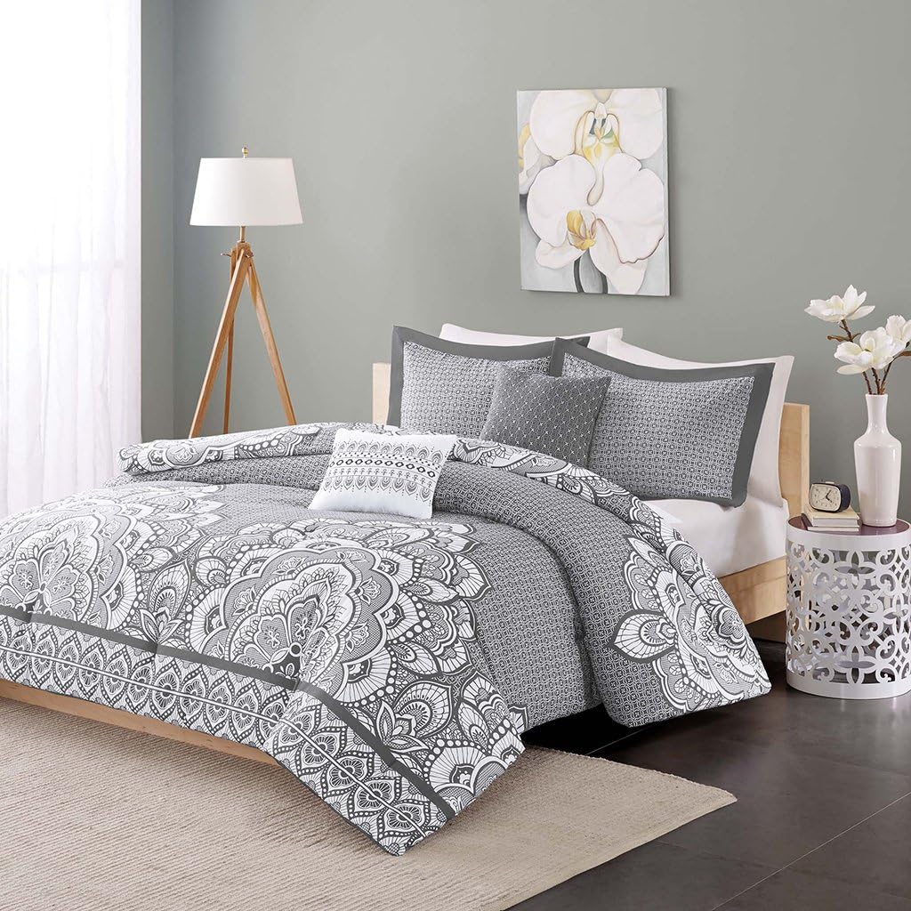 Amazon Com Intelligent Design Cozy Comforter Casual Damask Design Modern All Season Bedding Set With Matching Sham Decorative Pillow Full Queen Isabella Grey Home Kitchen